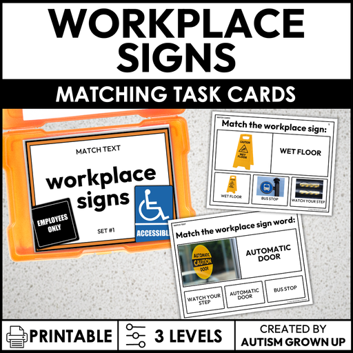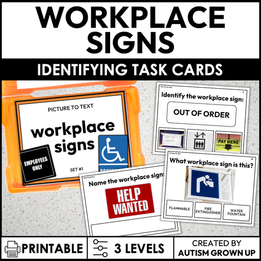 No reviewsOriginal price $2.00 - Original price $2.00Original price$2.00$2.00 - $2.00Current price $2.00| /These life skills task cards focus on workplace signs. Includes real photos and data collection sheet...