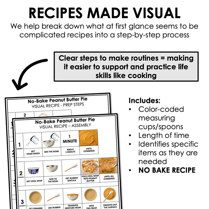 Visual recipes make it easy to teach and practice cooking skills in the classroom and at home. Plus, this meal prep + cooking activity can be a good one to incorporate into fun mealtime routines!