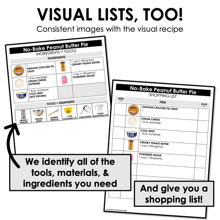 Visual recipes like these are a helpful tool in breaking down a recipe step-by-step. We include visuals of ingredients and tools needed to complete a recipe.