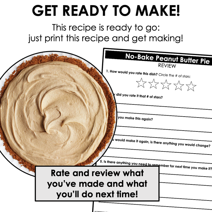 This visual recipe is for making Peanut Butter Pie! The recipe is broken into simple steps and is no-bake. Requires access to a hand mixer and fridge.