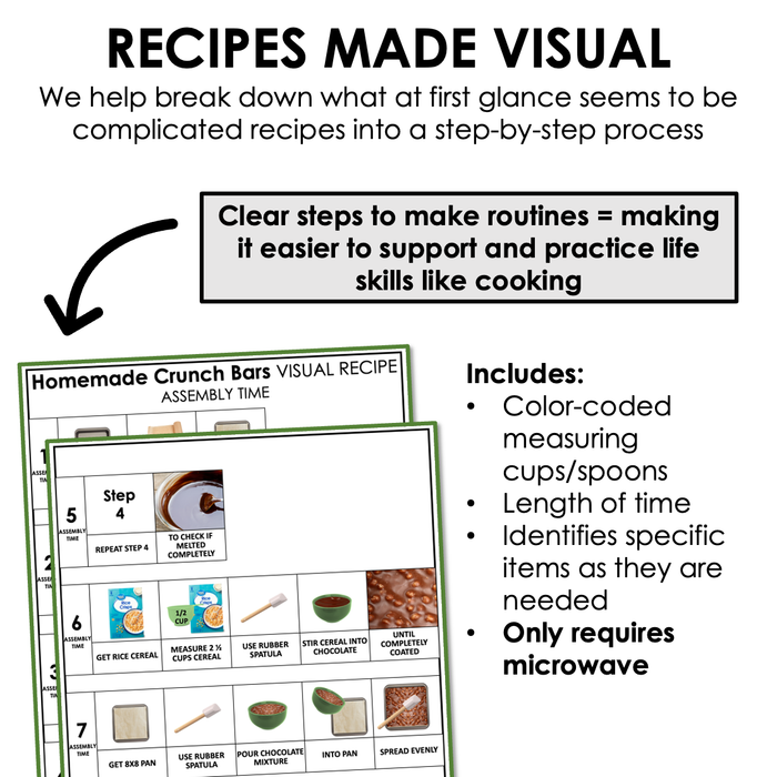 Visual recipes make it easy to teach and practice cooking skills in the classroom and at home. Plus, this cooking activity can be a good one to incorporate into fun mealtime routines!