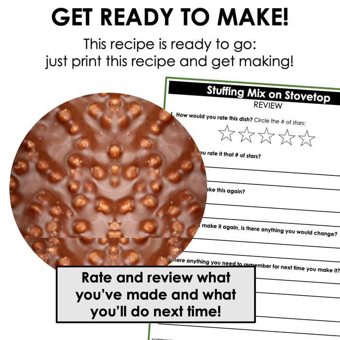 Recipe Review Sheet: After it's all said and done, it's always nice to reflect and document how things went. Learners can make adjustments to the recipe, take note of what they learned, make notes for next time, and rate and review the recipe for themselves.