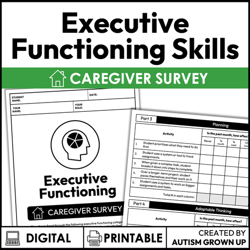No reviewsOriginal price $4.50 - Original price $4.50Original price$4.50$4.50 - $4.50Current price $4.50| /This Executive Functioning Caregiver Survey is for Caregivers supporting Autistic students. It can also be useful for any student who...