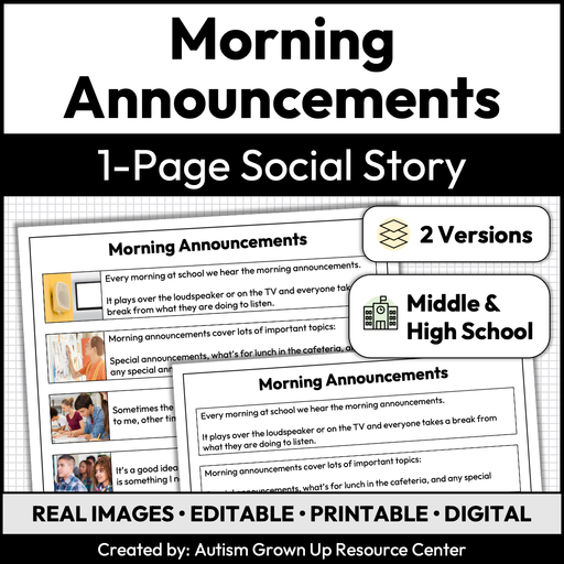Morning Announcements | 1-Page Social Story | Middle and High School