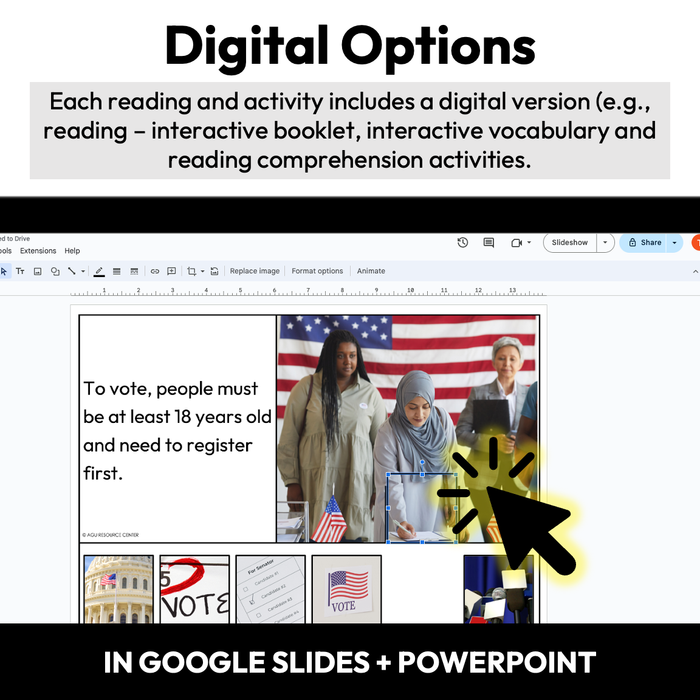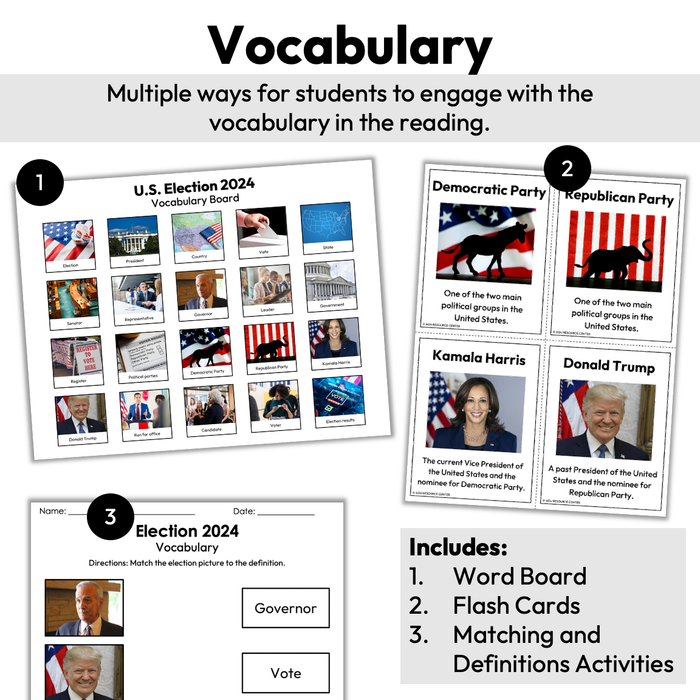 Cover an upcoming current event: the U.S. 2024 Election, with this reading and vocabulary lesson. Includes differentiated readings and activities for students to learn about this year’s election, the candidates, and why voting is important.