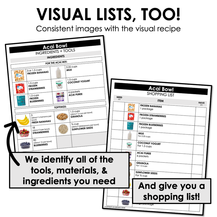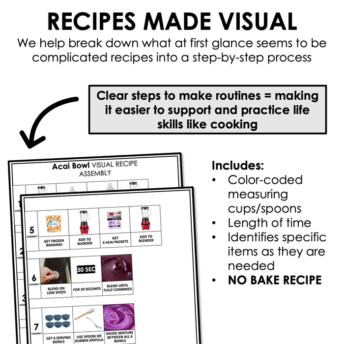 Visual recipes like these are a helpful tool in breaking down a recipe step-by-step. We include visuals of ingredients and tools needed to complete a recipe.You can email us at hello@autismgrownup.com if you have any feedback, questions, and/or requests for resources.