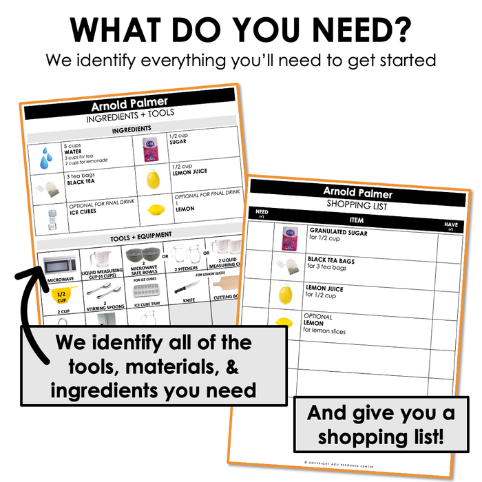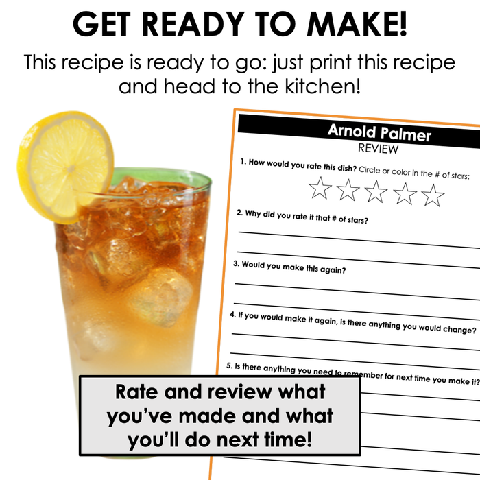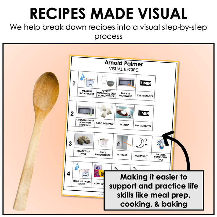 This visual recipe is for making Arnold Palmer drinks (lemonade + tea). You will find this to be a fun end of the year, ESY, or summer activity for all students to get involved in. It has a short cook time (a few minutes in the microwave) then put it in the fridge for a few hours or overnight, and it's ready to go!