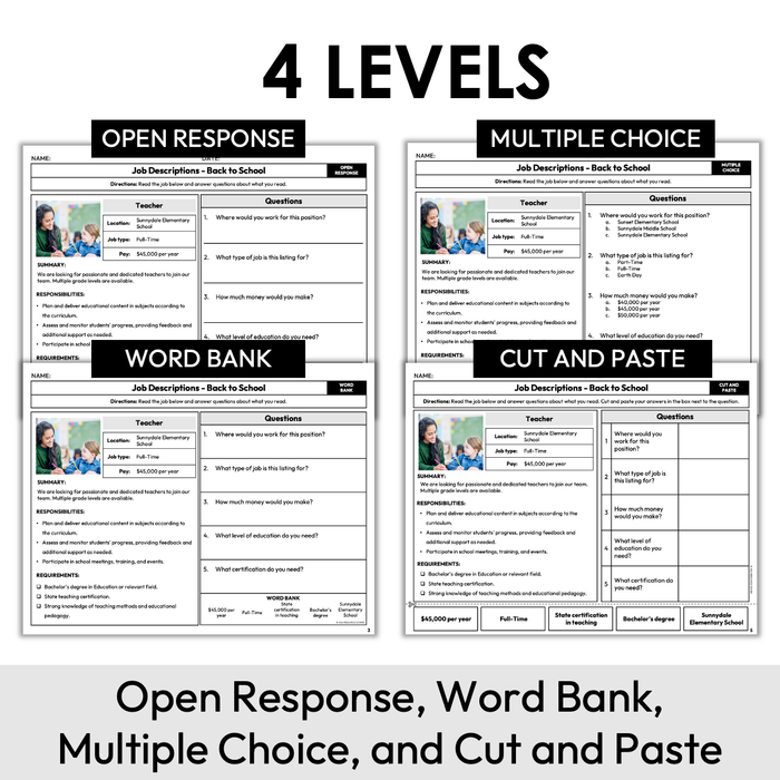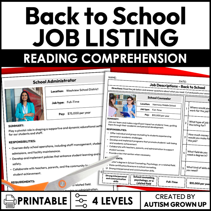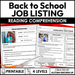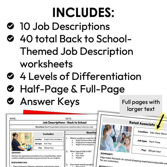 This resource focuses on reading job descriptions for Back to School related jobs or positions that become of note. Students will read the job description and answer accompanying reading comprehension and critical thinking questions. Includes real photos of the job site or employee in action.