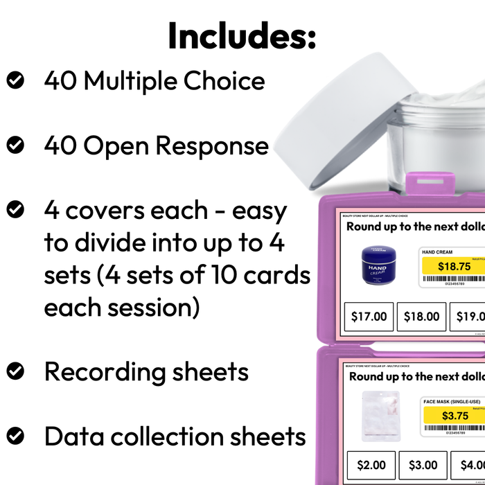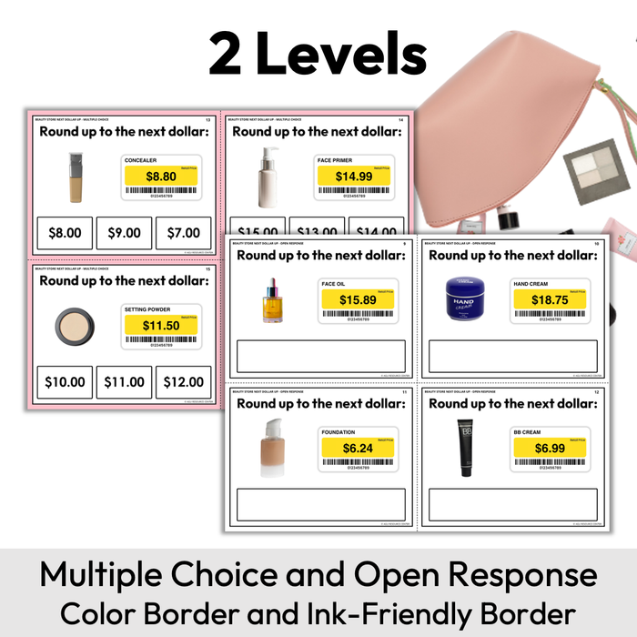 The Beauty Store Next Dollar Up Task Cards focus on rounding prices up to the next dollar. This set uses common items you typically see at the beauty store. Includes realistic images, student recording sheets, and data collection sheets.