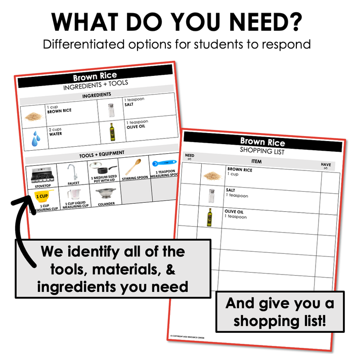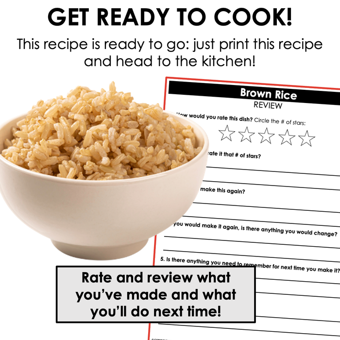 Recipe Review Sheet: After it's all said and done, it's always nice to reflect and document how things went. Learners can make adjustments to the recipe, take note of what they learned, make notes for next time, and rate and review the recipe for themselves.