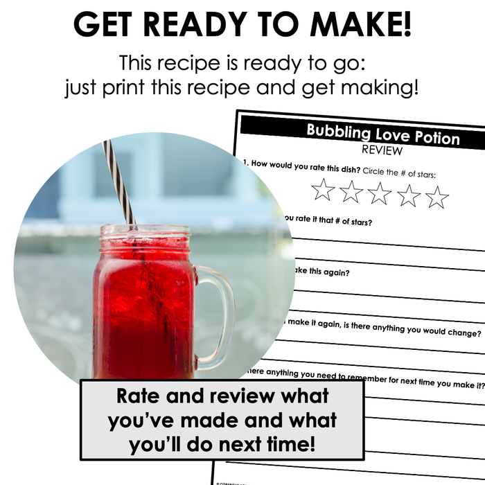 A note on love potions as a concept: One thing we really like about this particular recipe is that students brew it for themselves and drink it for themselves. If your activity is set up in a way that involves sharing we strongly recommend taking care in describing any fictional "effects" the potion might have. The purpose of the exercise is a fun drink with a neat bubbly effect!