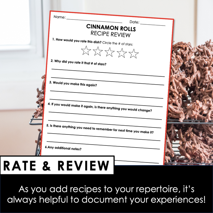 Recipe Review Sheet: After it's all said and done, it's always nice to reflect and document how things went. Learners can make adjustments to the recipe, take note of what they learned, make notes for next time, and rate and review the recipe for themselves.