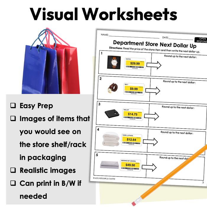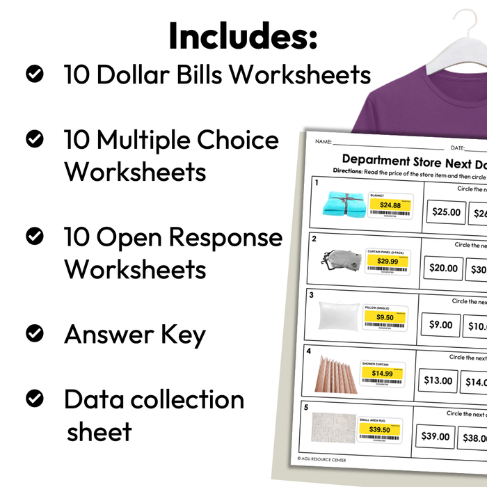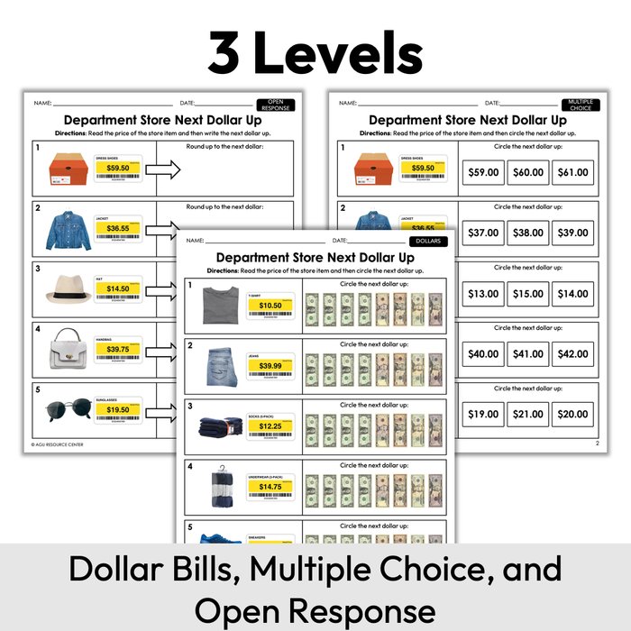 The Department Store Next Dollar Up Worksheets focus on rounding prices up to the next dollar. This set of worksheets uses common items you typically see at the department store. Includes realistic images and 3 differentiated levels: counting dollar bills, multiple choice, and open response.