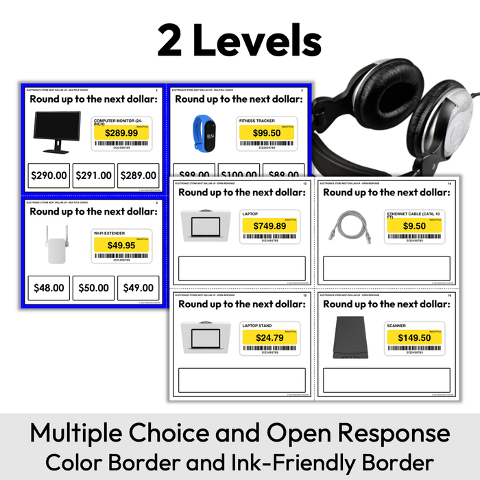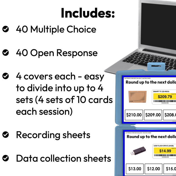 The Electronics Store Next Dollar Up Task Cards focus on rounding prices up to the next dollar. This set uses common items you typically see at the electronics store. Includes realistic images, student recording sheets, and data collection sheets.