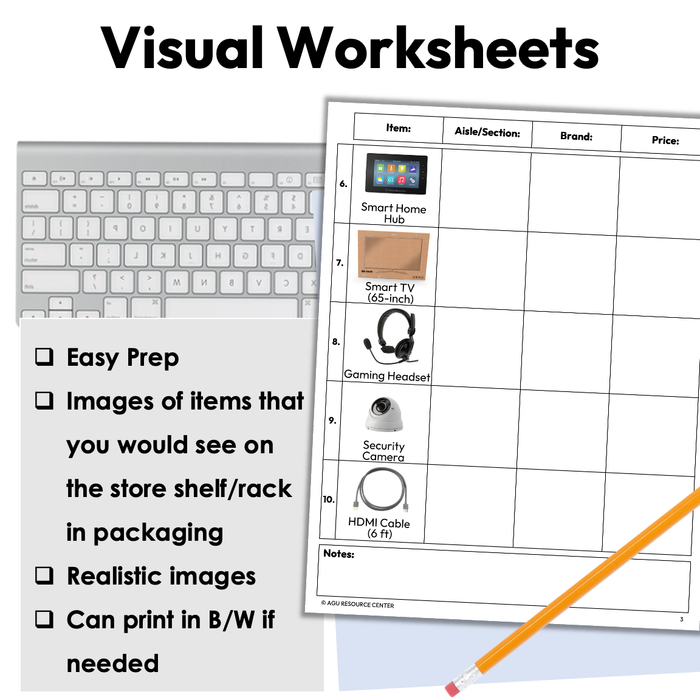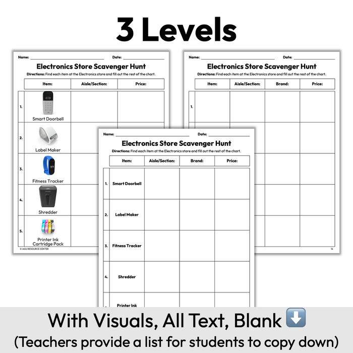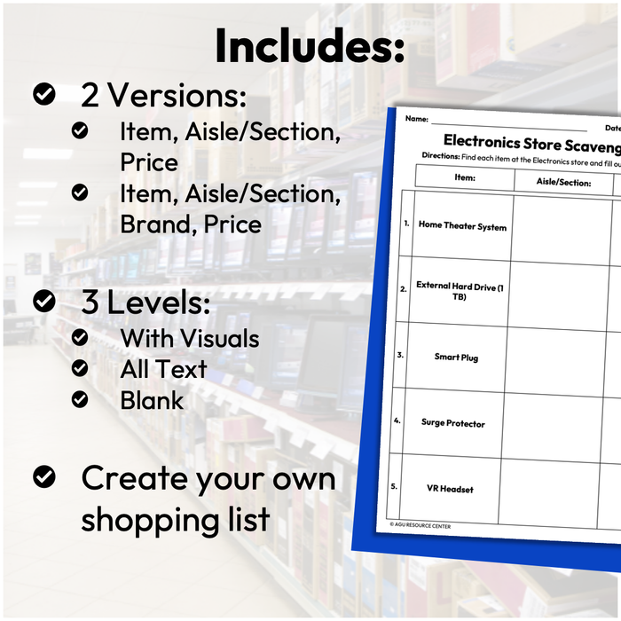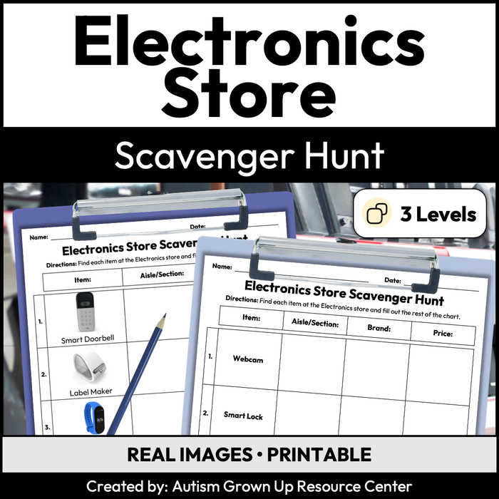 The Electronics Store Scavenger Hunt Worksheets focus on finding items at the store. This set of worksheets uses common items you would see at the electronics store. Includes realistic images and 3 differentiated levels: with visuals, all text, and blank (for teachers/students to create their own lists).