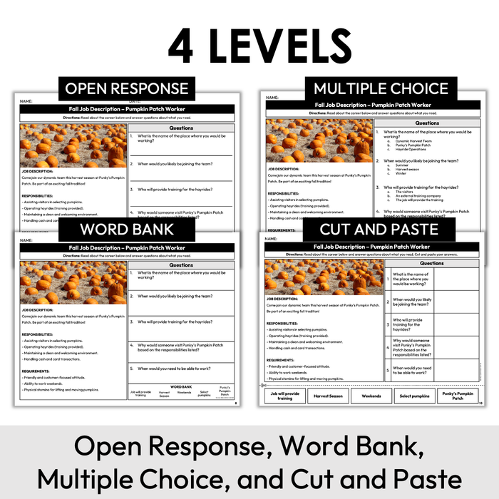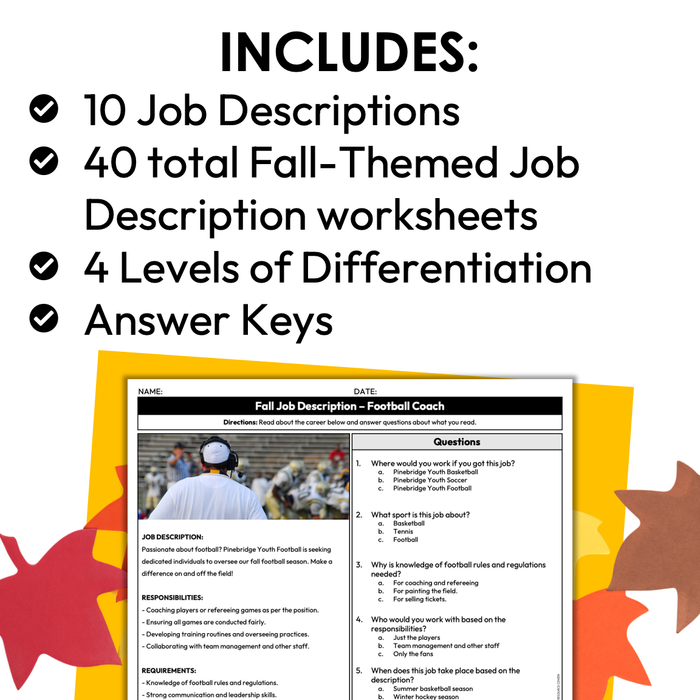 Looking for a life skills activity related to Fall or Autumn? This resource focuses on reading job descriptions for Fall seasonal jobs or positions that become of note during the Fall season. Students will read the job description and answer accompanying reading comprehension and critical thinking questions. Includes real photos of the job site or employee in action.