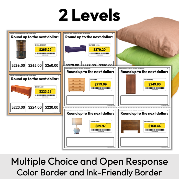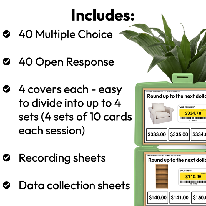These Furniture & Decor Store Next Dollar Up Task Cards focus on rounding prices up to the next dollar. This set uses common items you typically see at the furniture store. Includes realistic images, student recording sheets, and data collection sheets.
