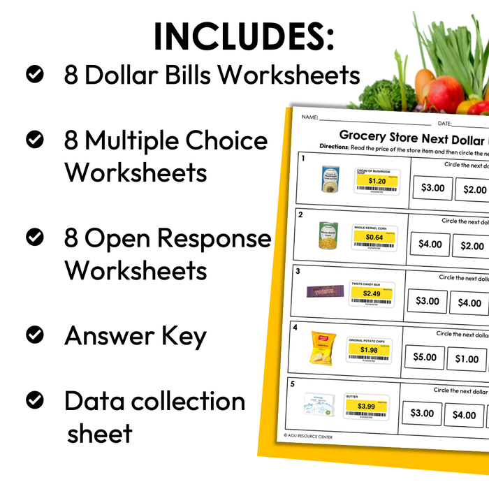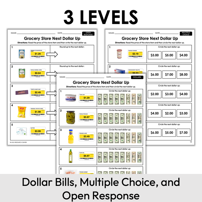 The Grocery Store Next Dollar Up Worksheets focus on rounding prices up to the next dollar. This set of worksheets uses common items you typically see at the grocery store. Includes realistic images and 3 differentiated levels: counting dollar bills, multiple choice, and open response.