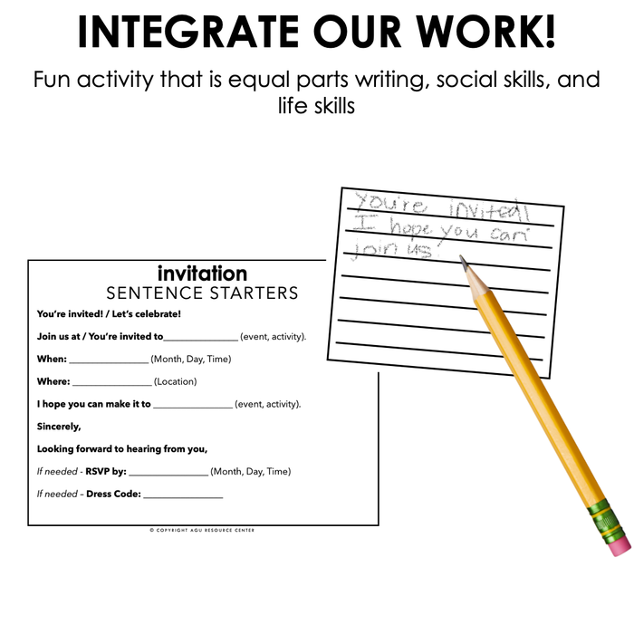 This Invitation card resource is a fun-filled – yet also life skills + academic – activity for your special education classroom. It gives you and your students a chance to create invitations of their own for upcoming events and activities (e.g., classroom parties, birthday events) and practice a life skill like writing cards and notes to others.