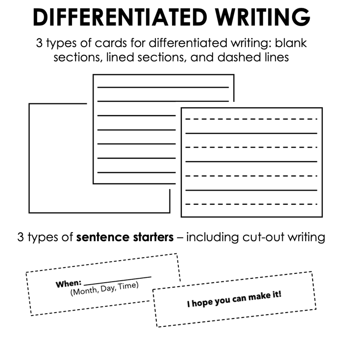 Differentiation options: this resource includes 3 options for your students to complete the activity: blank sections, lines, and dashed lines. There are 3 types of sentence starters: full page, short sentences, and cut-out options.