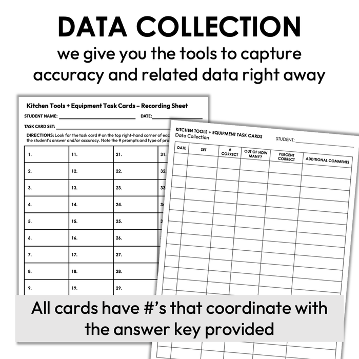 These life skills task cards focus on kitchen tools and equipment. Includes real photos and data collection sheets. This set focuses on matching kitchen tools and equipment. An easy way to teach and review common kitchen tools and equipment vocabulary that you can use across multiple settings, activities, and ages with age-respectful photos.
