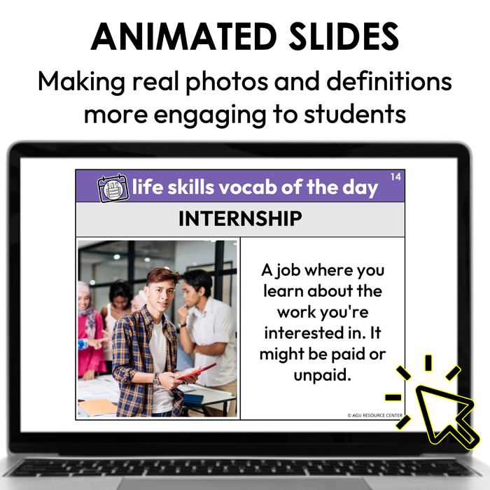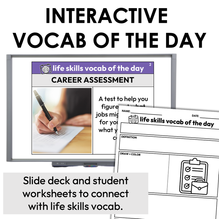 Let’s focus on life skills vocabulary! This set centers on Vocational Skills. Each day, you will focus on a specific life skills term, its definition, and then students will apply their learning. Includes a slide deck with 25 life skills terms under that category paired with real photos and student worksheets to expand their understanding.