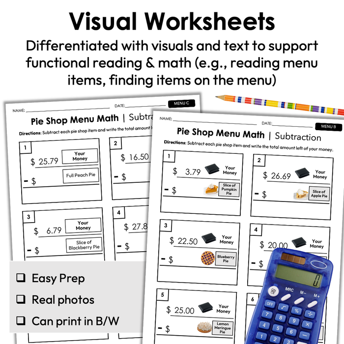 Students can practice functional reading and math skills using pie shop menus! This particular resource focuses on subtraction: starting with a budget and subtracting items to determine how much money is left over.