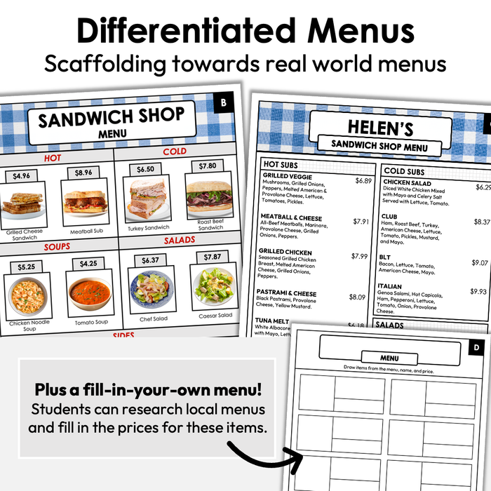 Can be used with students across support needs and abilities. We've included differentiated levels based on whole numbers to decimals as well as visuals to represent each menu item.