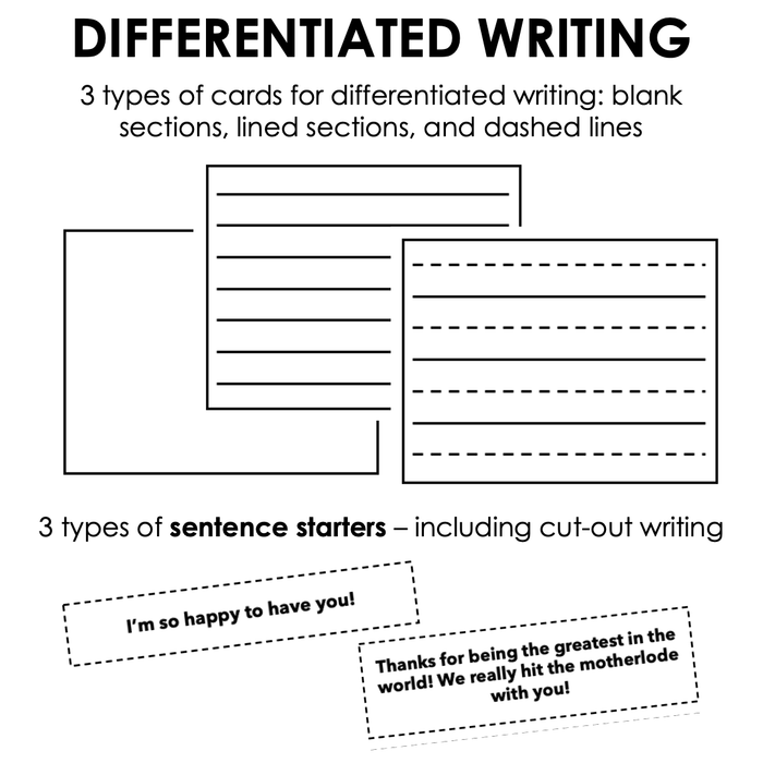 Differentiation options: this resource includes 3 options for your students to complete the activity: blank sections, lines, and dashed lines. There are 3 types of sentence starters: full page, short sentences, and cut-out options.