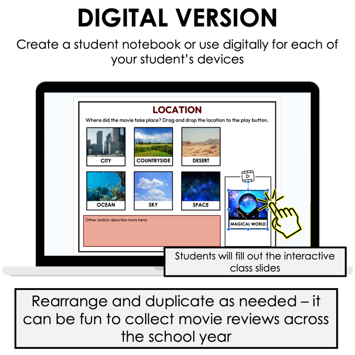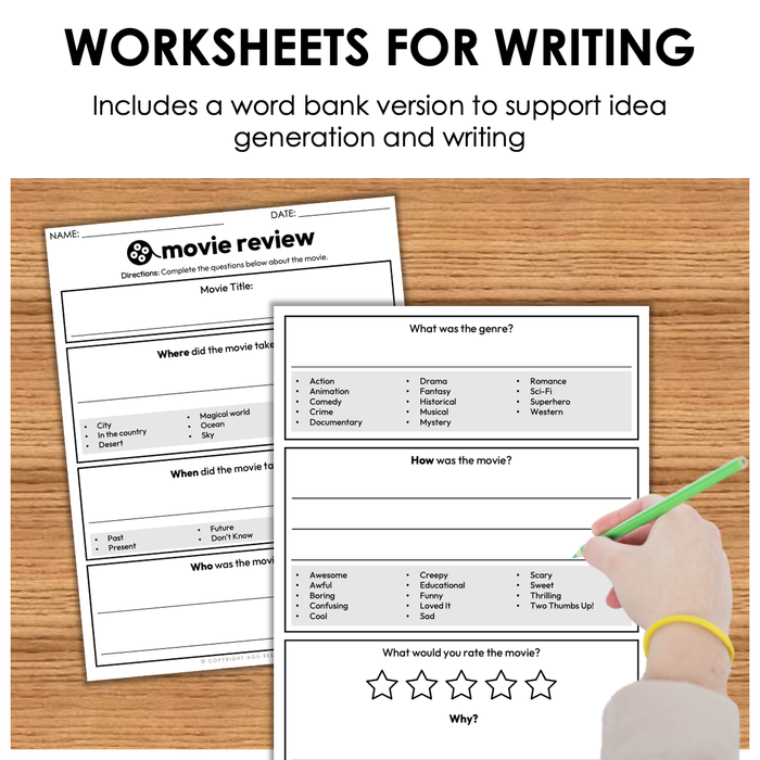 Use this movie review bundle with visual worksheets and interactive classroom slides to supplement watching and reviewing a movie in your classroom.