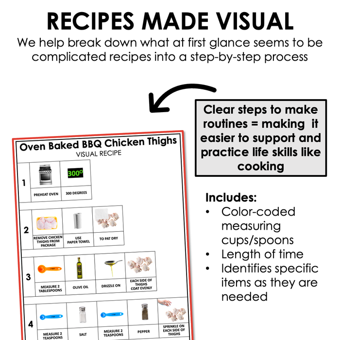 Visual Recipe: Visuals of step-by-step directions to create the recipe - including visuals of measuring cups & spoons. We provide a walkthrough of the recipe that makes it easier to preview and refer to during cooking.
