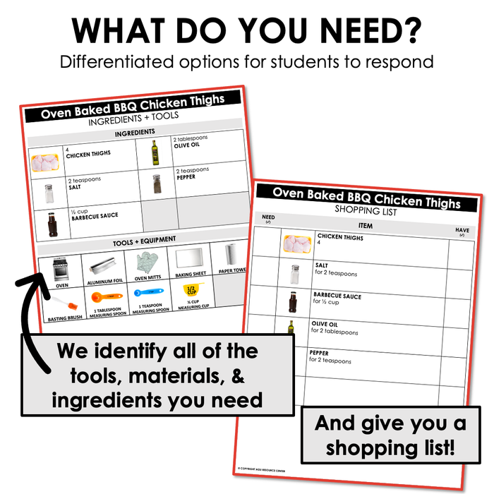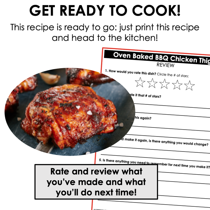 This visual recipe is for making oven baked BBQ chicken thighs. Visual recipes make it easy to teach and practice cooking skills in the classroom and at home. Plus, this cooking activity can be a good one to incorporate into holiday fun!