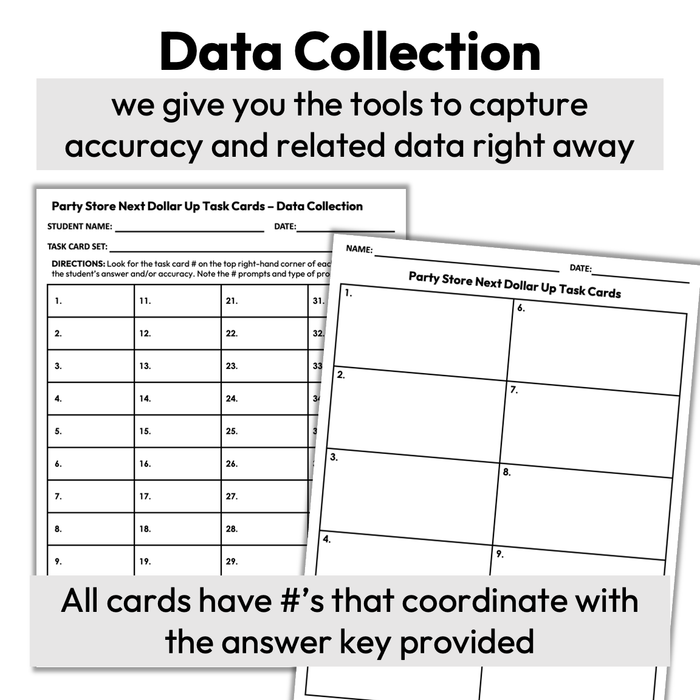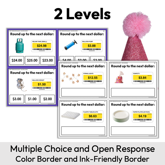 These Party Store Next Dollar Up Task Cards focus on rounding prices up to the next dollar. This set uses common items you typically see at the party store. Includes realistic images, student recording sheets, and data collection sheets.