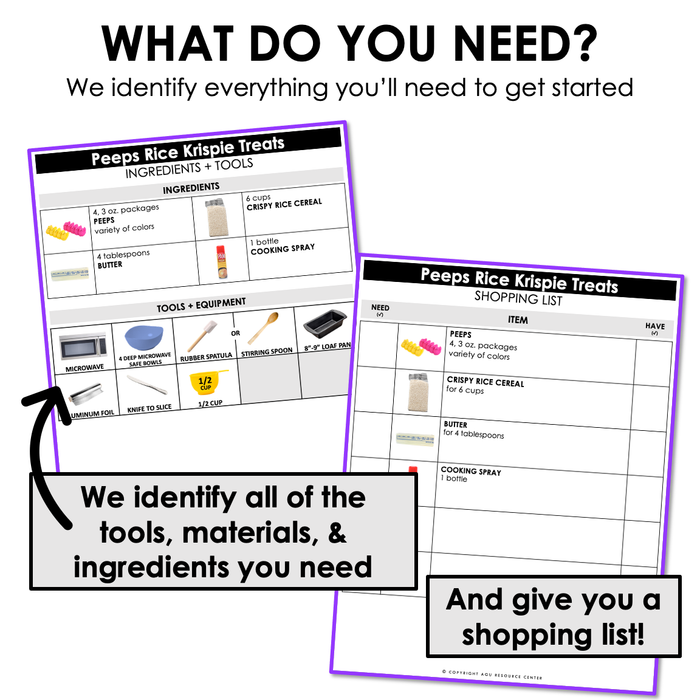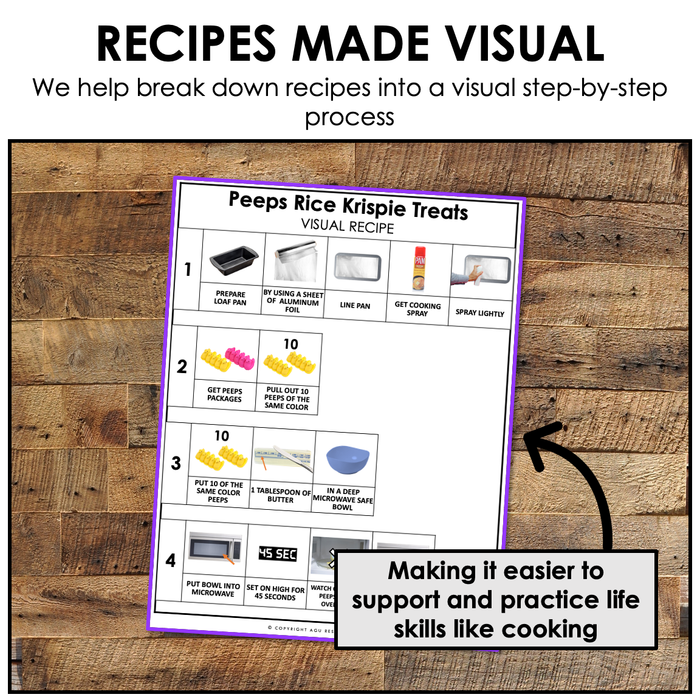 This Easter visual recipe is for making Peeps + Rice Krispie treats. You will find this to be a fun Easter activity for all students to get involved in. It only requires access to a microwave!