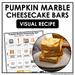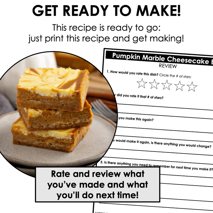 This visual recipe is for making Pumpkin Marble Cheesecake Bars! The recipe is broken into simple steps and is no-bake. Requires access to a fridge and hand mixer.
