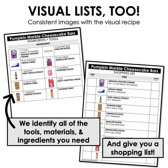 Visual recipes like these are a helpful tool in breaking down a recipe step-by-step. We include visuals of ingredients and tools needed to complete a recipe.