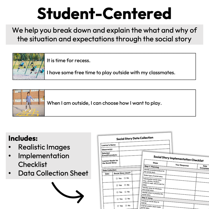 This one-page social story walks the student through the expectations and options during recess. Social stories or social narratives like these are an evidence-based teaching strategy & support for Autistic students.