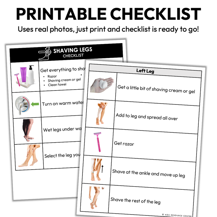 Use this Shaving Legs Checklist for hygiene and personal self care routines. It walks the learner or individual through the steps of shaving legs as a hygiene routine.
