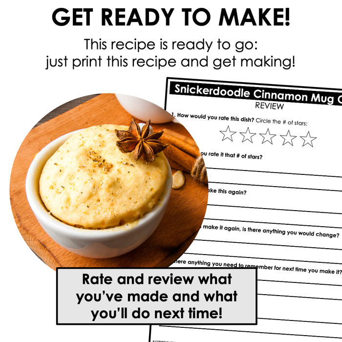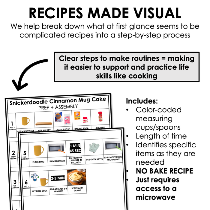 This visual recipe is for making Snickerdoodle Cinnamon Mug Cakes! The recipe is broken into simple steps, is no-bake, and requires only access to a microwave.