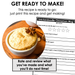 Ingredients + Tools: One page visual of ingredients and tools needed to complete the recipe. Also included: length of time to make, servings, and amounts needed for ingredients.