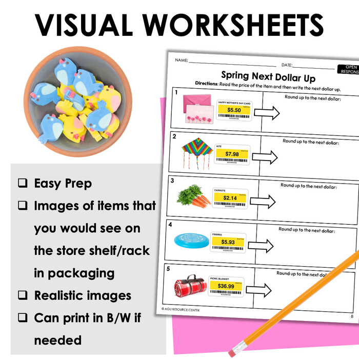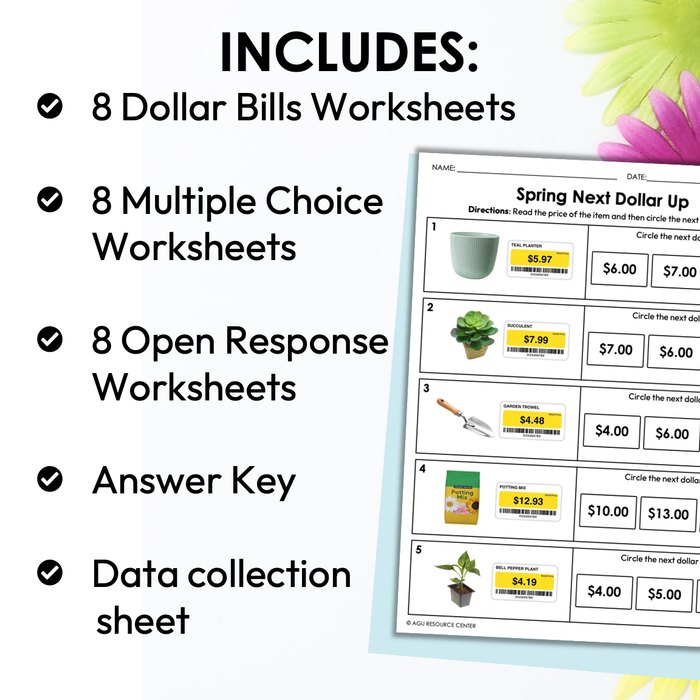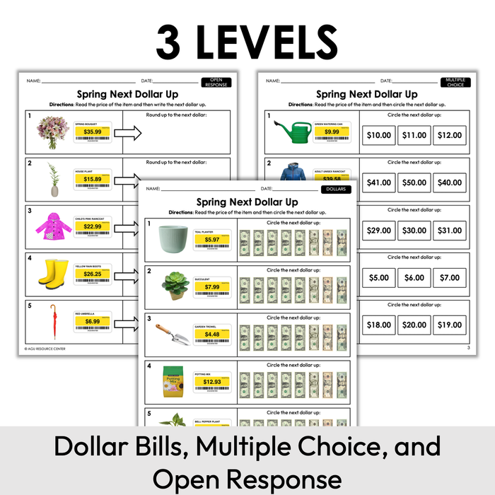 The Spring Next Dollar Up Worksheets focus on rounding prices up to the next dollar. This set of worksheets uses common items you typically see across the Spring season. Includes realistic images and 3 differentiated levels: counting dollar bills, multiple choice, and open response.