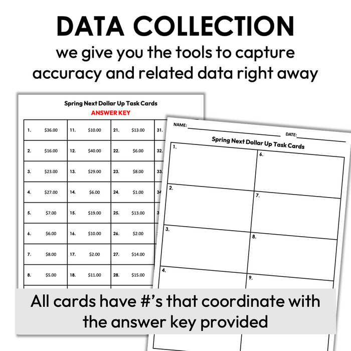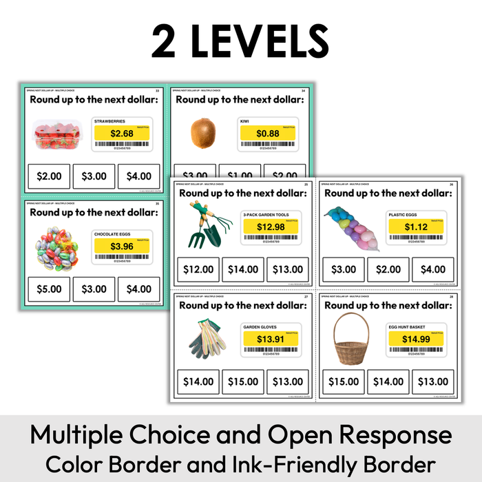 The Spring Next Dollar Up Task Cards focus on rounding prices up to the next dollar. This set uses common items you see across the Spring season at the store. These items look just like they would when you pick them off the store shelf or rack. Includes realistic images, student recording sheets, and data collection sheets.
