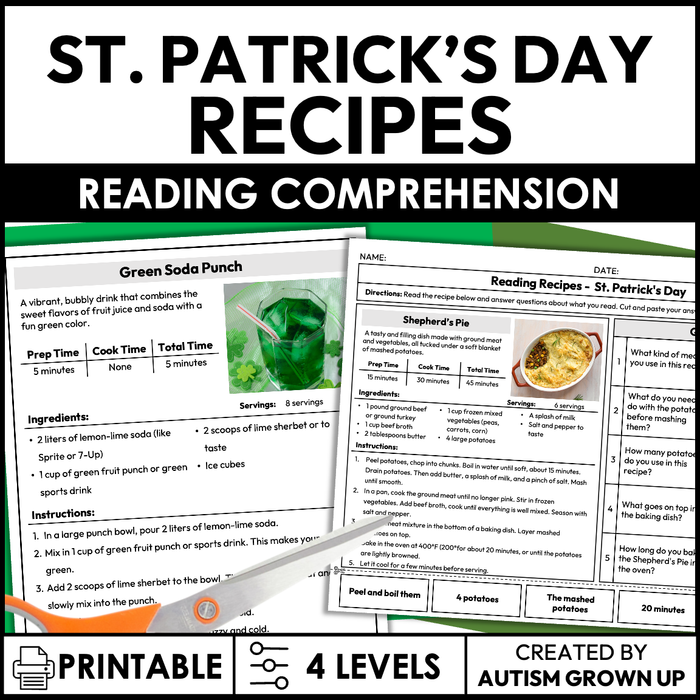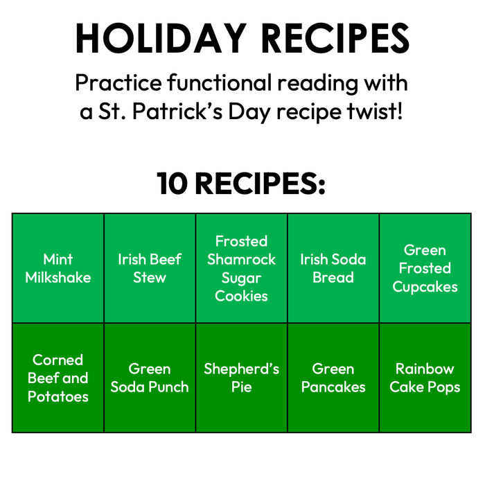 Looking for a life skills activity related to St. Patrick's Day? This resource focuses on reading recipes for Holiday treats, snacks, and meals. Students will read the recipe and answer accompanying reading comprehension and critical thinking questions. Includes real photos of the final product.