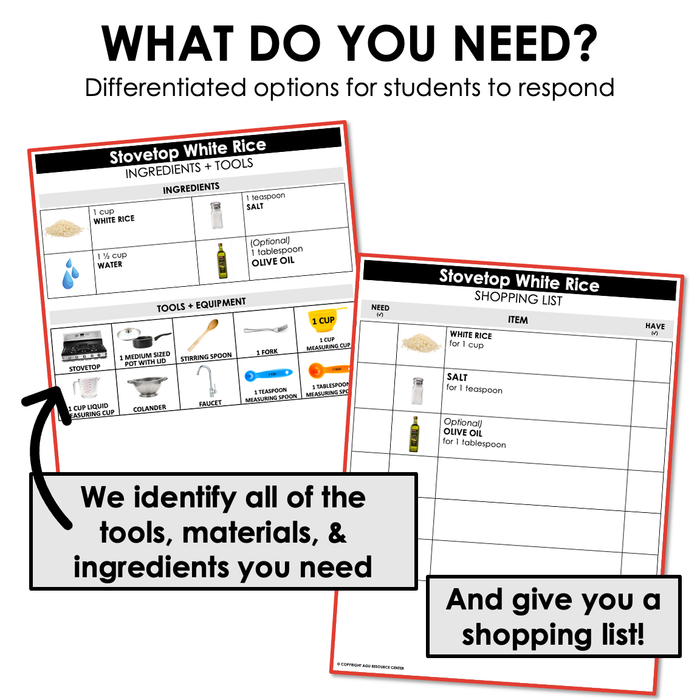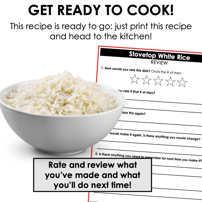 This visual recipe is for making white rice on the stovetop. Visual recipes make it easy to teach and practice cooking skills in the classroom and at home. Plus, this cooking activity can be a good one to incorporate into holiday fun!