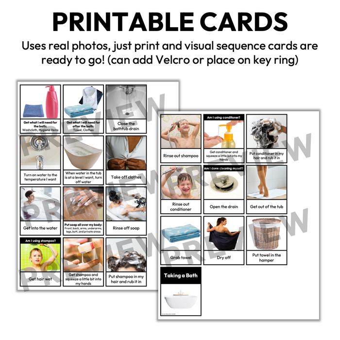 Use these Taking a Bath Visual Sequence cards for hygiene and personal self care routines. It walks the learner or individual through the steps of bathingas a hygiene routine.