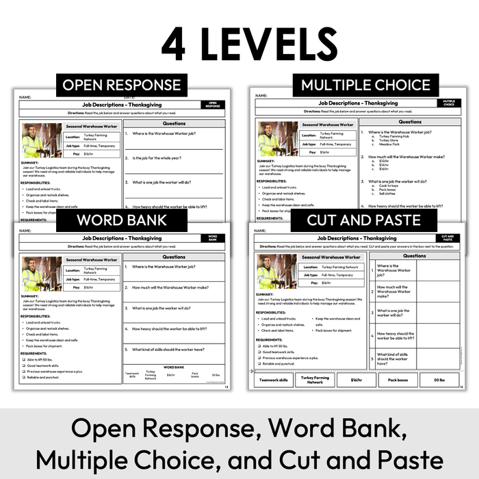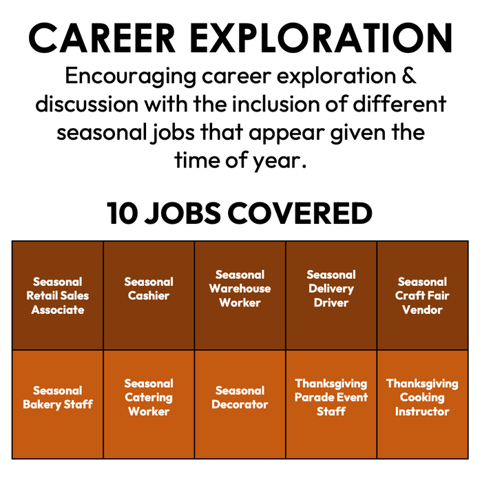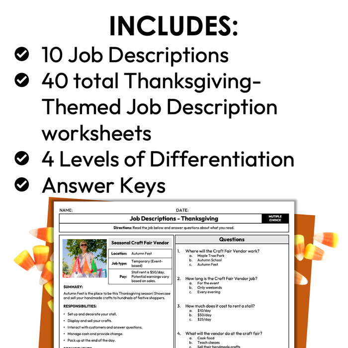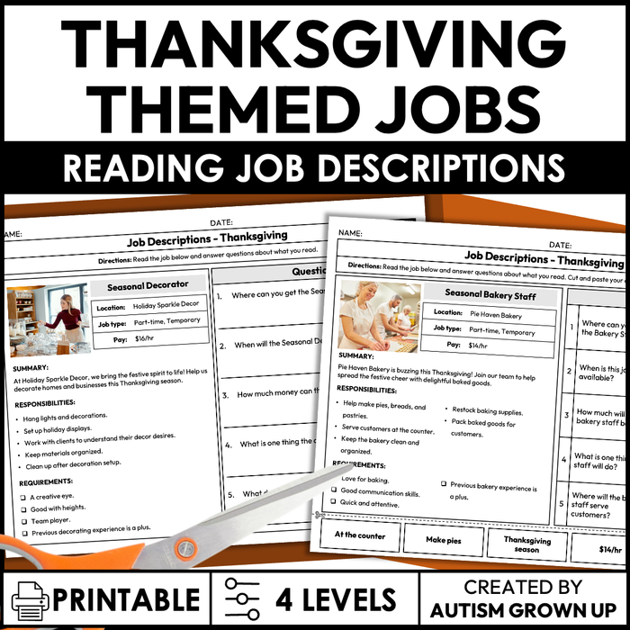Looking for a life skills activity related to Thanksgiving? This resource focuses on reading job descriptions for Thanksgiving seasonal jobs or positions that become of note during the Thanksgiving season. Students will read the job description and answer accompanying reading comprehension and critical thinking questions. Includes real photos of the job site or employee in action.