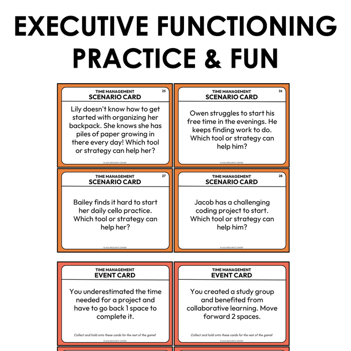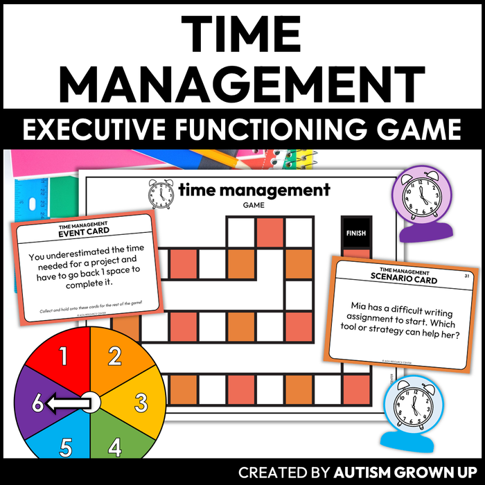 Practicing executive function can be fun with this Time Management Executive Function Game. Includes scenarios, ideas for strategies, and practice executive functioning skills! Play as a game with the included game board and question cards about time management.