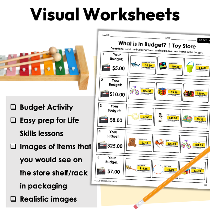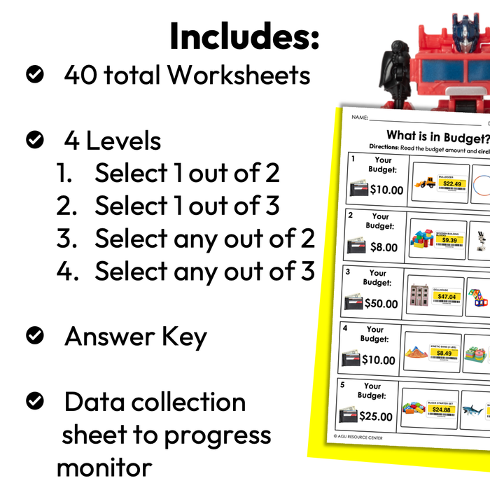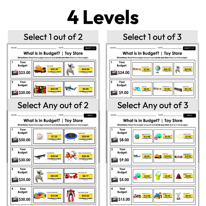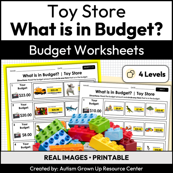 These Toy Store What is in Budget? Worksheets focus on reading budgets and matching items that fall within a given budget. This set of worksheets uses common items you see at the toy store. Includes realistic images and 4 differentiated levels: selecting only 1 item, selecting any item, field of 2, field of 3.